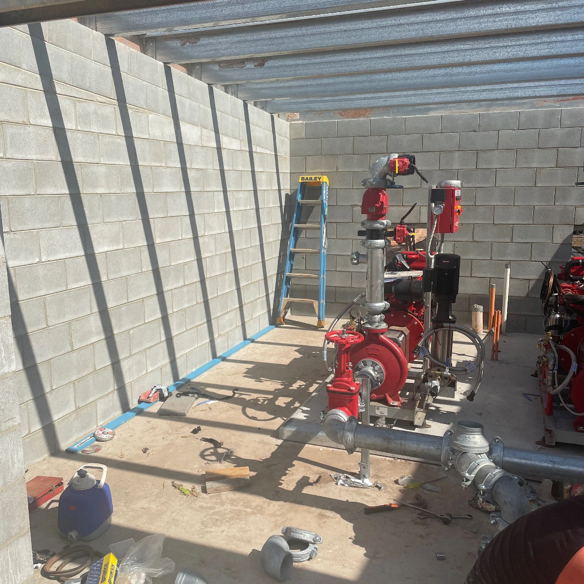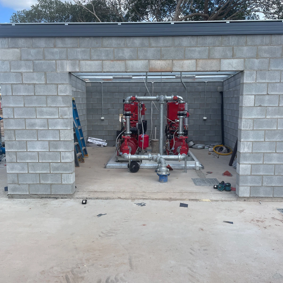 This comprehensive upgrade involved installing a new main water meter, Fire Booster, fire pump, pump house, and additional pump systems and tanks to meet the hydrant supply requirements.